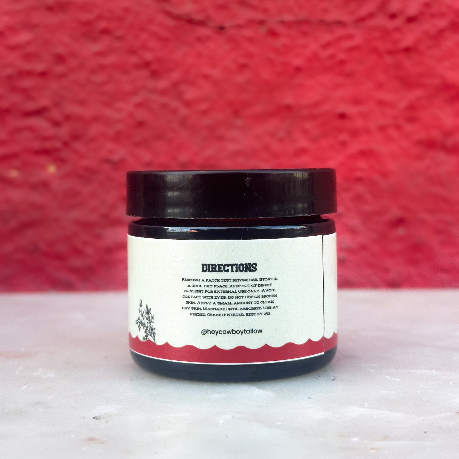 A deeply nourishing balm crafted from grass-fed beef tallow, this full body moisturizer is rich in vitamins and essential fatty acids that support skin barrier health. Whipped to a smooth, buttery texture and lightly scented, it melts effortlessly into the skin, delivering lasting hydration and a natural glow. Safe for body and any dry spots in need of extra care. Safe for face as well.